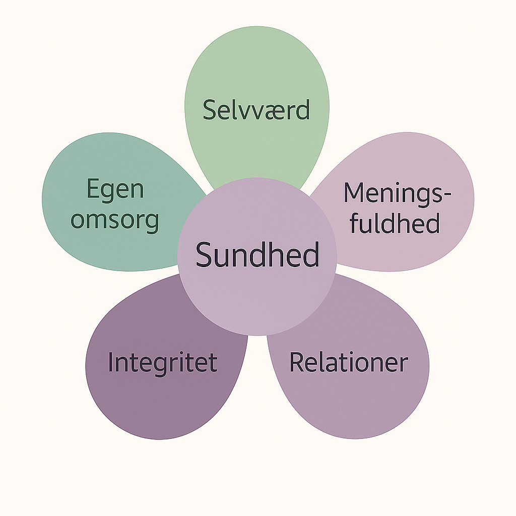 Jeg har selv skabt en sundhedsblomst, inspireret af Kitwoods model, men med fokus på det, jeg ser som grundstenene i et sundt liv: